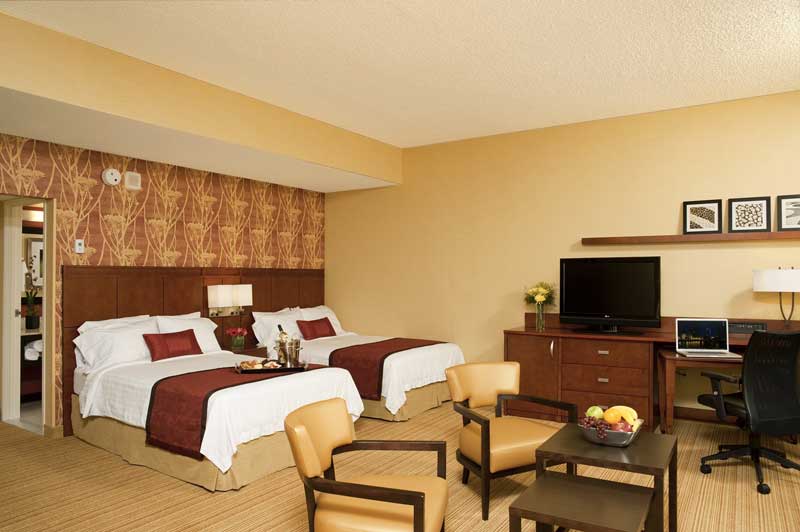 Suites are comfortable and equipped with modern amenities. Each suite provides a separate living area, making it great for families or business travelers. Enjoy the spacious living arrangements paired with stunning city views!