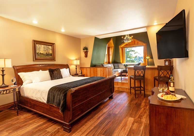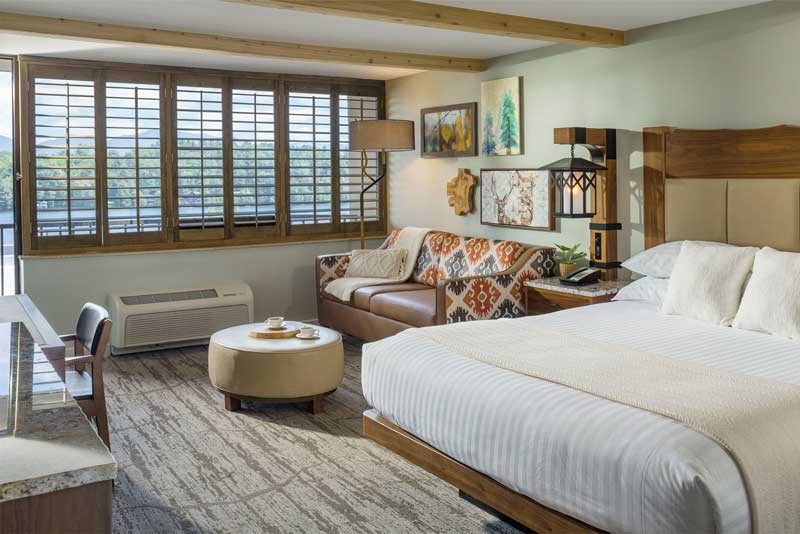 After your meal, relax at the spa, or take a dip in the indoor pool. The lodge offers luxurious accommodations with beautifully-designed rooms that embody the spirit of the Adirondacks. Each room presents comfort and elegance.