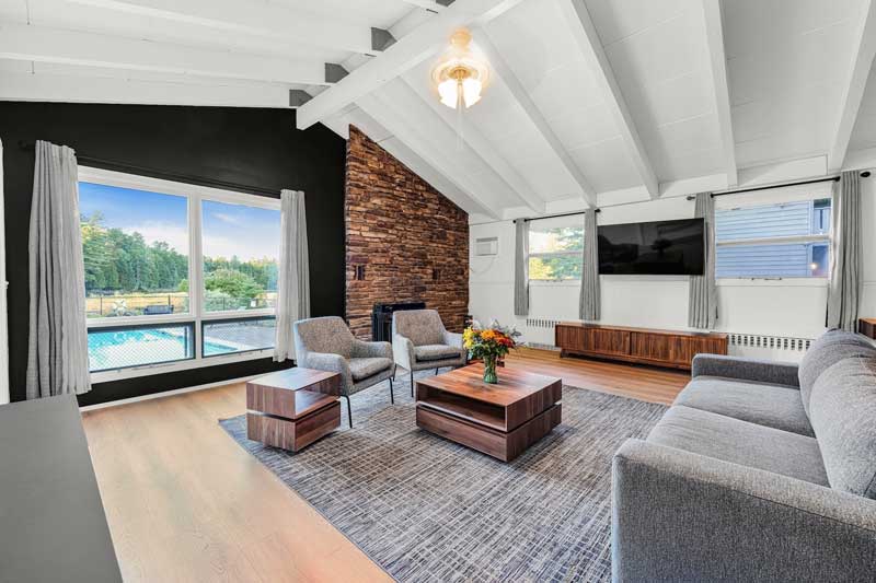 The lodge showcases the spirit of the Adirondacks with its warm, rustic feel. Each room comes equipped with essential amenities to ensure a comfy stay.