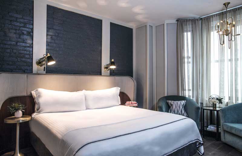 Rooms are elegantly designed with a nod to historic style, offering comfort alongside beautiful decor that reflects the glam of old New York.